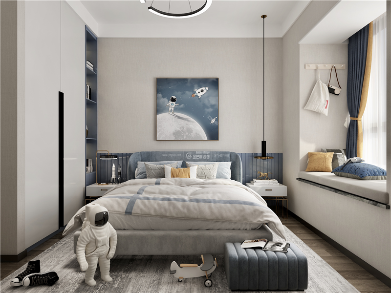 藍藍的顏色清新、活潑,搭配可愛的裝飾畫,溫馨靜美,傳遞的是天真、單純的家居態度。