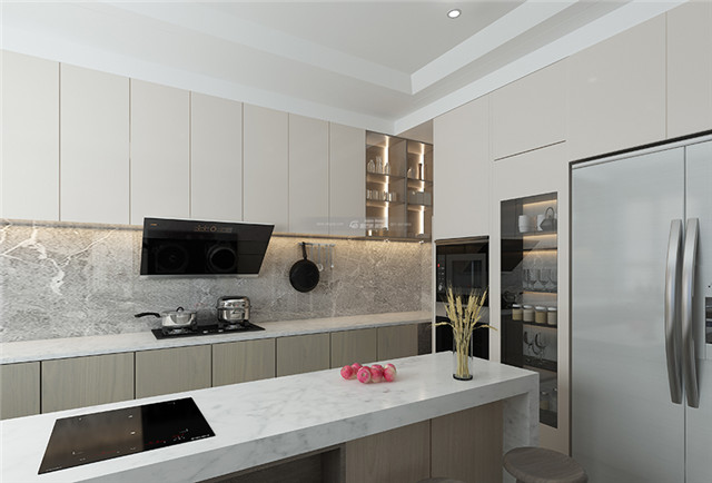 大大的窗子,明亮的氛圍,食物仿佛也有了更加鮮明的顏色。中間設置島臺,同時滿足中西廚烹飪需求,明亮、時尚的空間氛圍。