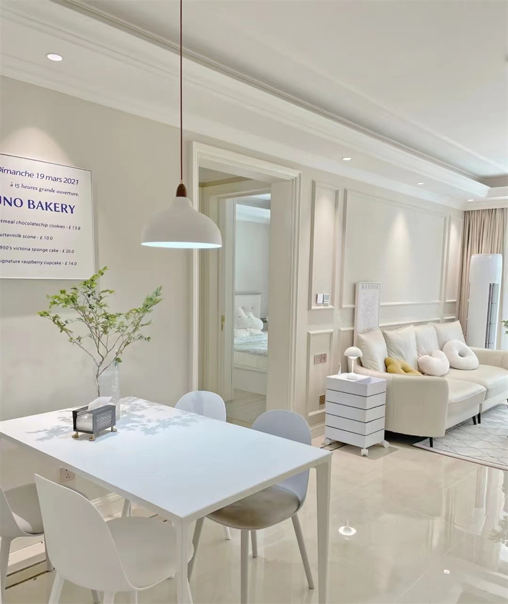 奶油風的燈光設計,以氛圍感十足的無主燈設計為主,打造奶油風燈光設計的層次感,一般采用基礎照明,重點照明和裝飾照明三種層次。通常采用筒燈以及隱藏式燈帶,達到基礎照明照亮空間的需求,然后采用射燈或者軌道燈,來對某個特殊的區域進行重點照明,這樣不僅符合奶油系風格的極簡大氣,同時還可以均勻地進行空間照明。