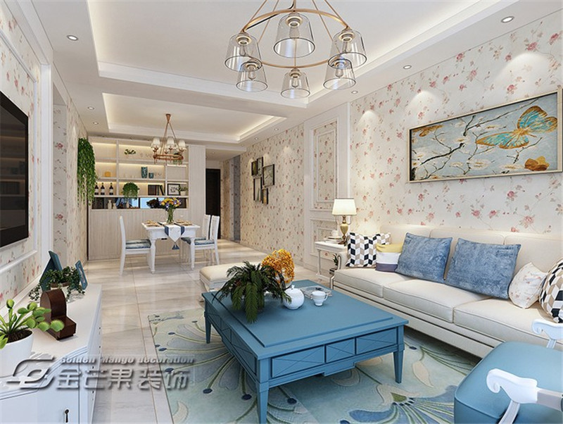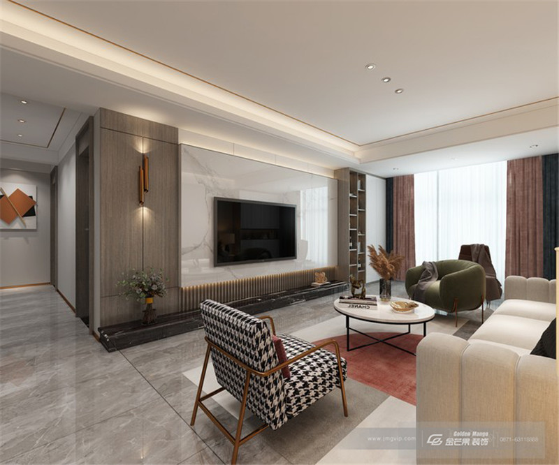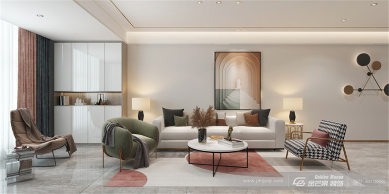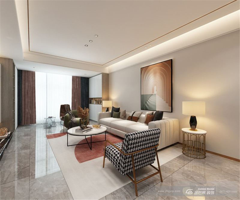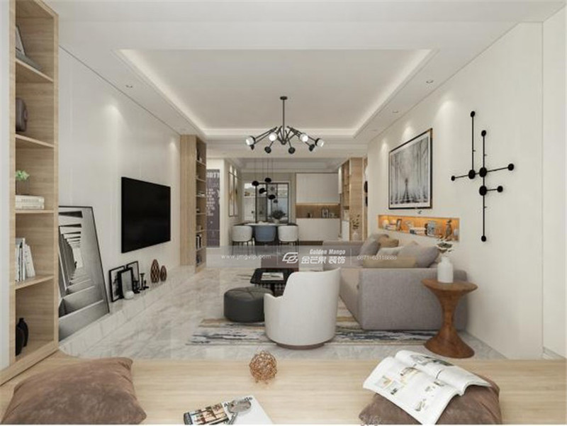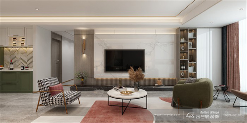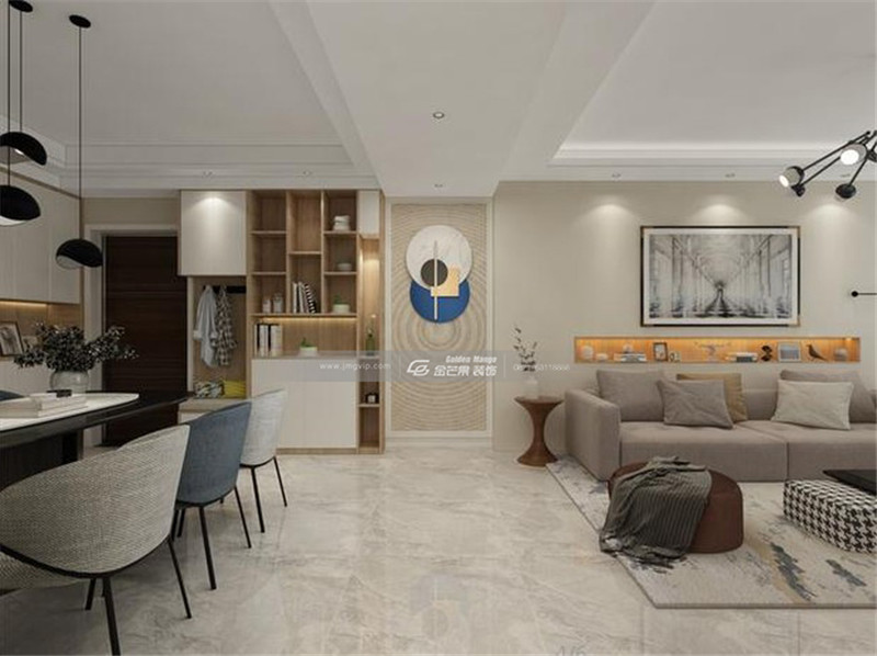 沙發背景墻裝飾靜中顯動,讓家居氛圍在舒適的基礎上更增活潑,和客廳燈飾呼應。